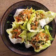 Cut the warm chicken into chunky strips and tip into the bowl with the lettuce.