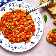 Crush half the garlic and add this to the pan, along with the tomatoes, paprika, vinegar, beans, sugar