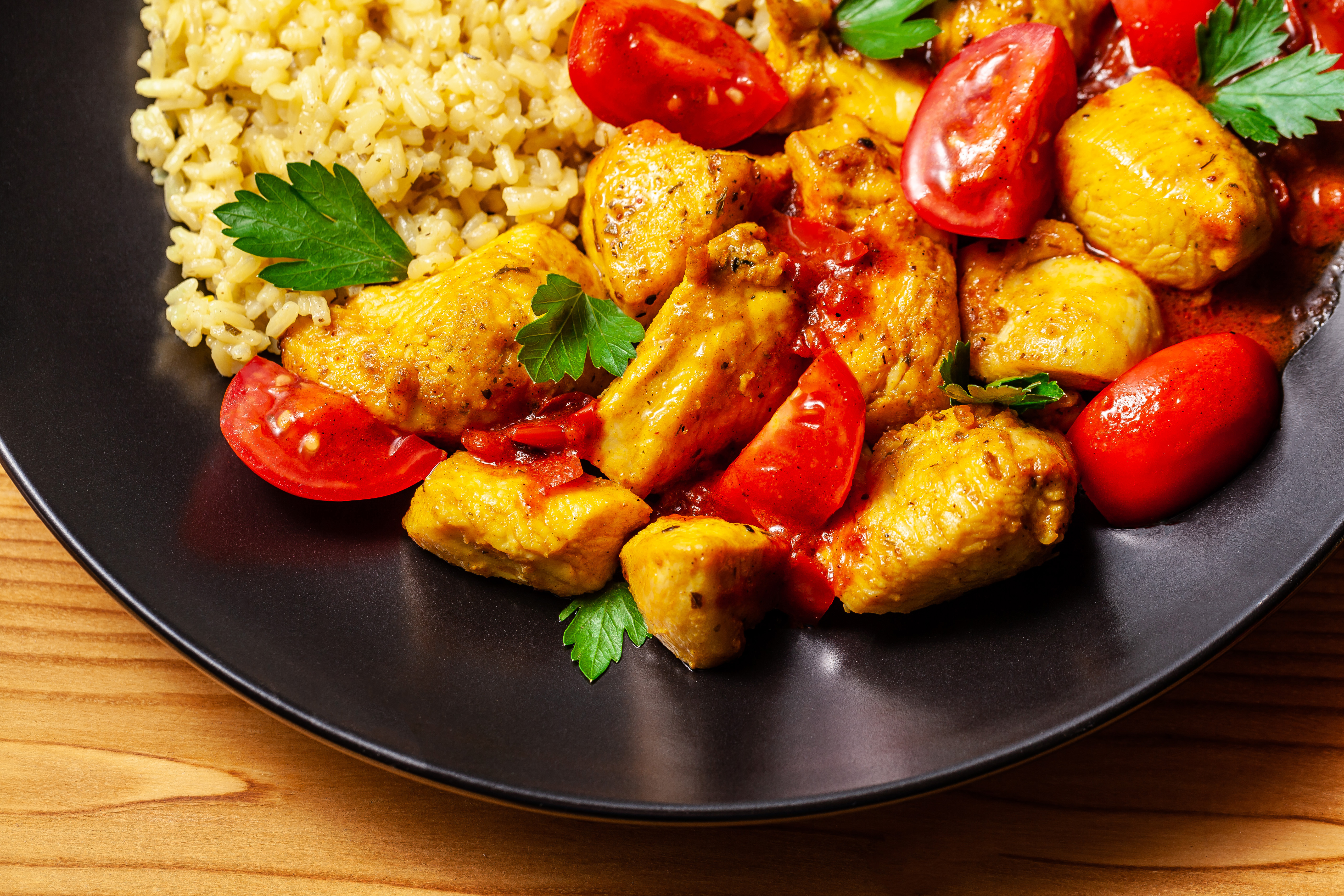 3. Add the chicken, tinned tomatoes, mushrooms, garlic, and coriander to an oven proof dish and cook for 45 minutes at 180 C / Gas 4.